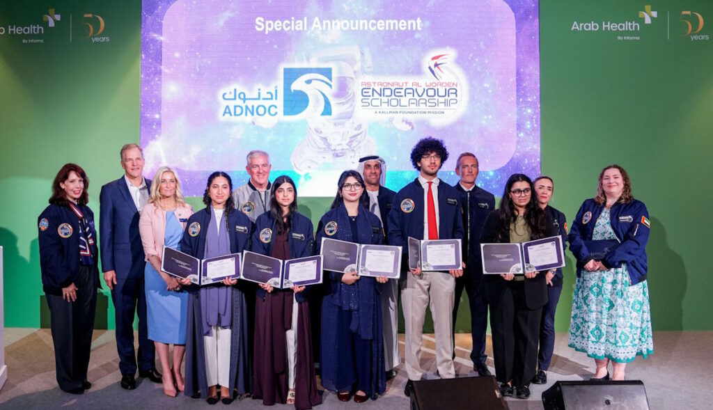 The winning Emirati students of the Astronaut Al Worden Endeavour Scholarship announced at Arab Health